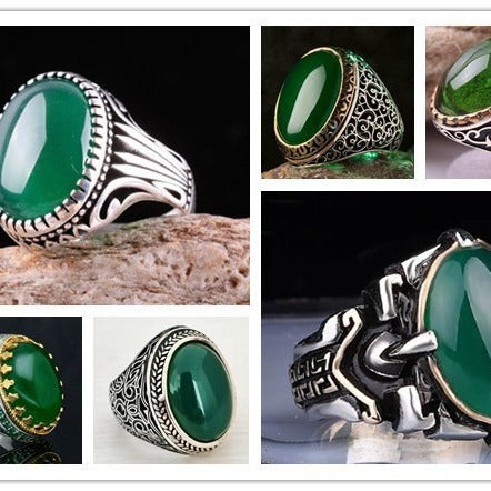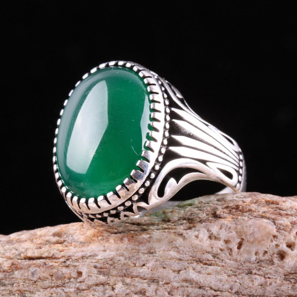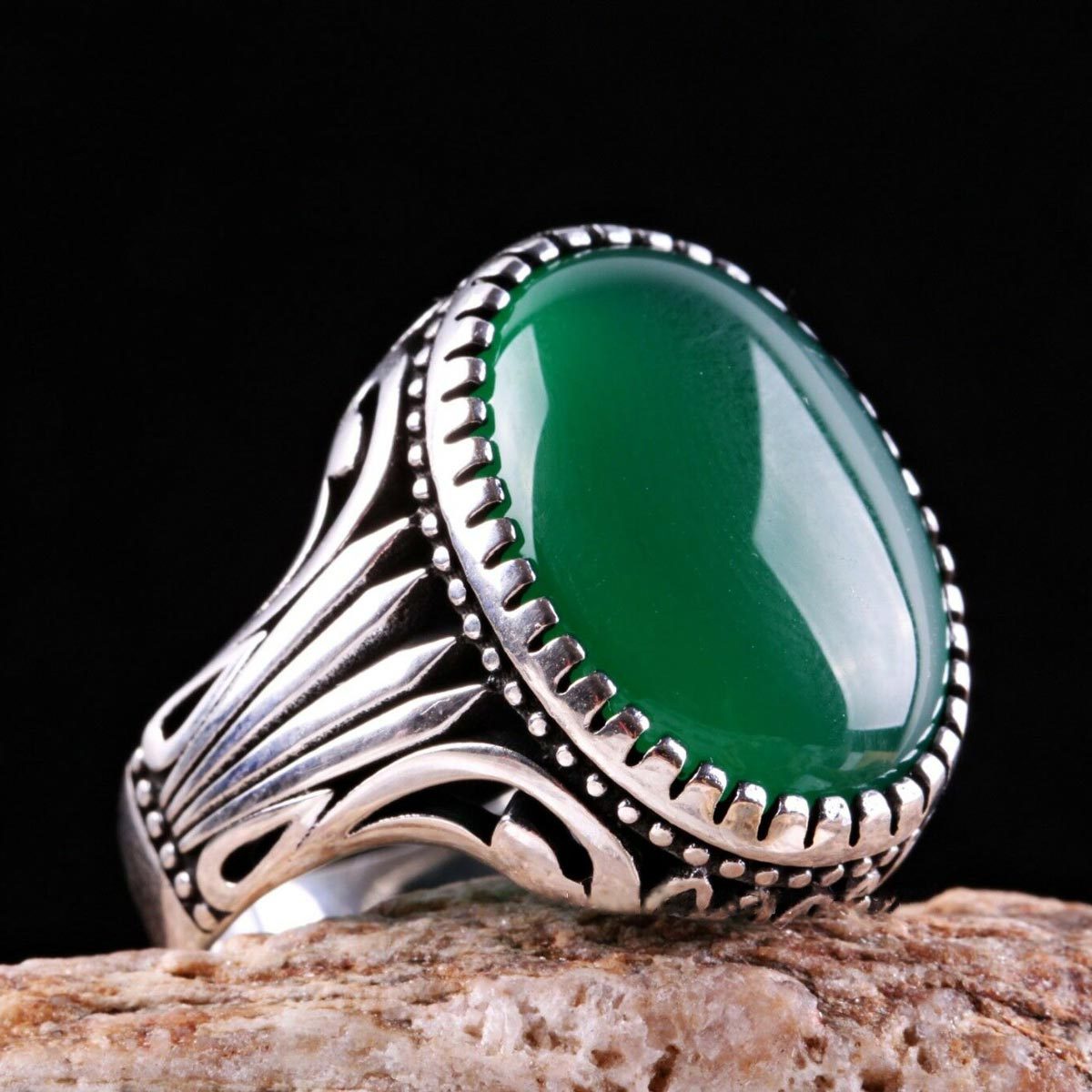 خاتم رجالي بنقش التماثيل – زمردي وفضي قديم فاخر