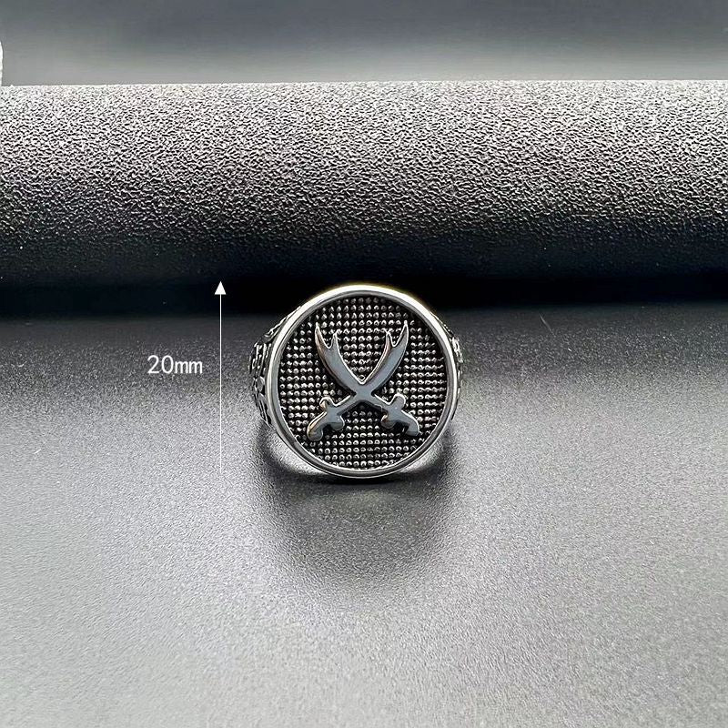 خاتم رجالي فولاذ تيتانيوم مصقول – تصميم سكين مزدوج جريء